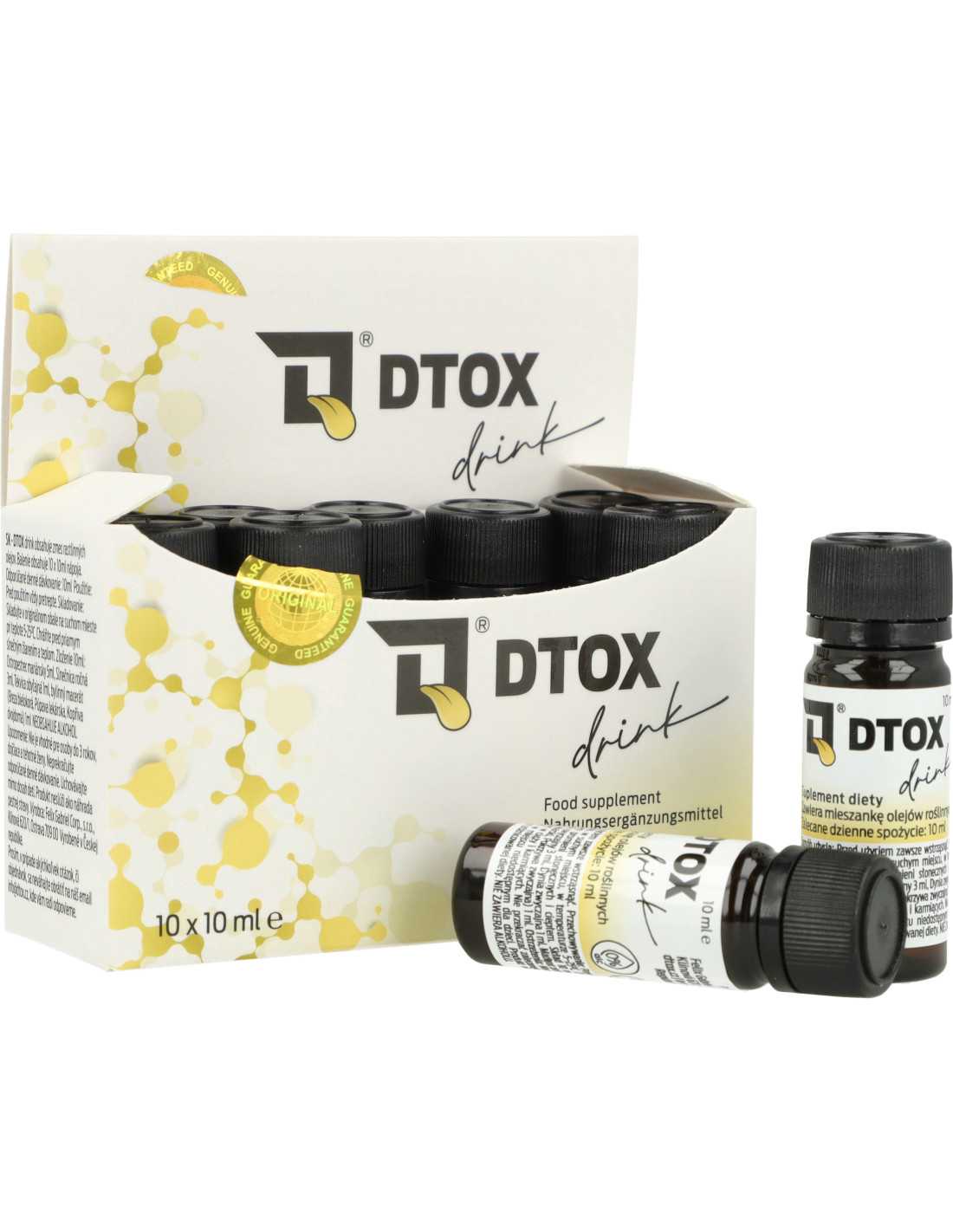 DTOX Drink BOX contains 10 single-dose vials (10 ml each) of a plant-based dietary supplement formulated with a blend of cold-pressed oils and a four-herb herbal macerate.