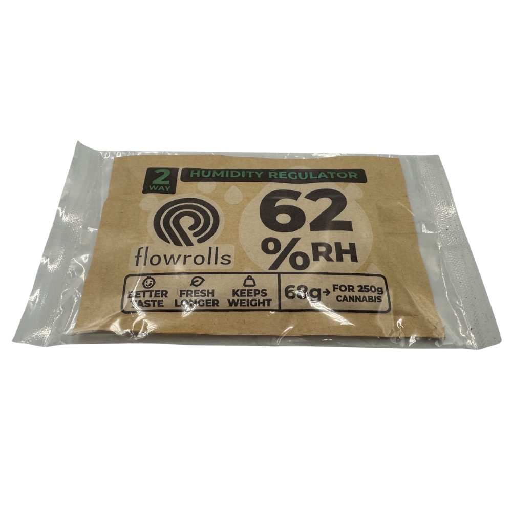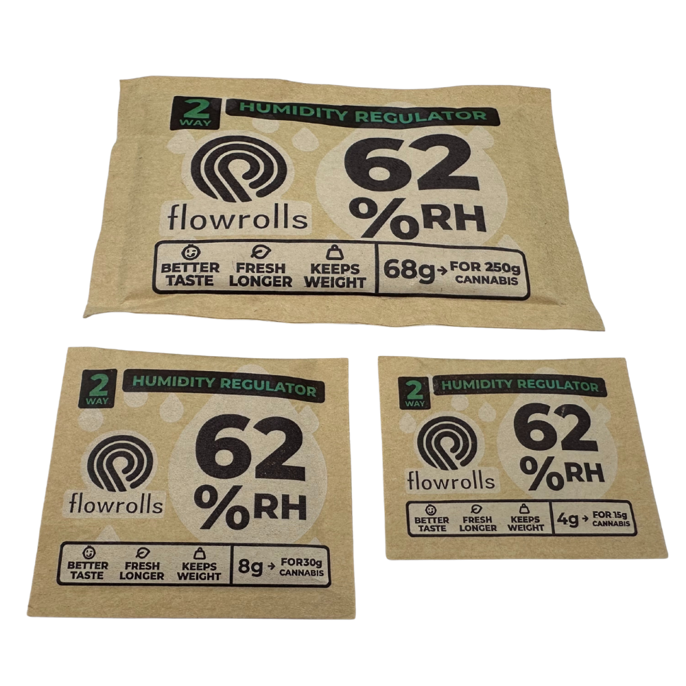 Flowrolls 62% humidity regulators are designed for CBD flowers, medical cannabis and other delicate botanicals. Using two-way humidity control technology, each sachet absorbs or releases moisture as needed to maintain an RH level of around 62% — the ideal point for preserving aroma, texture and overall quality.