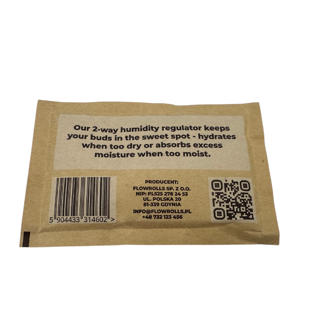 Flowrolls uses plant-based fibers infused with a solution of water, carrageenan, mineral salts (sodium chloride and potassium chloride) and trisodium citrate. This clean, minimal and fully safe formulation ensures stable humidity regulation without affecting the taste or aroma of your herbs. The sachets are odorless, non-toxic and chemically stable, making them perfectly suitable for contact with cannabis flowers.