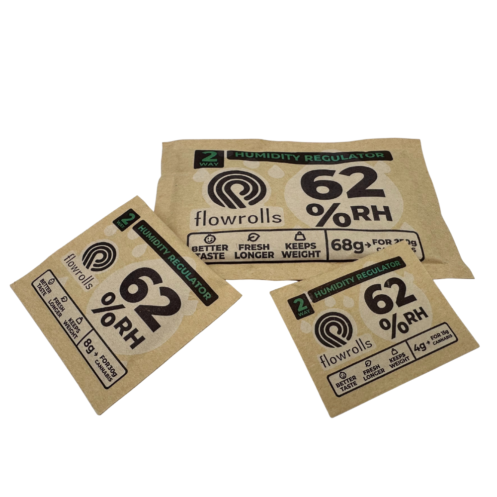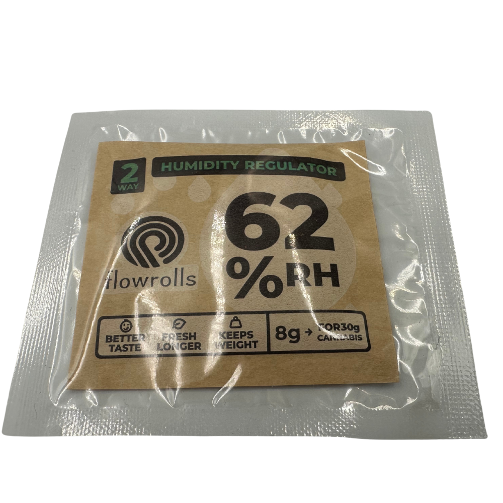 Flowrolls 62% humidity regulators are designed for CBD flowers, medical cannabis and other delicate botanicals. Using two-way humidity control technology, each sachet absorbs or releases moisture as needed to maintain an RH level of around 62% — the ideal point for preserving aroma, texture and overall quality.